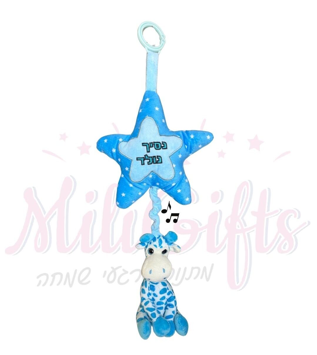 תליון מוזיקלי בעיצוב כוכב עם ג’ירפה מתוקה, מבד רך ונעים, המשמיע מנגינה עדינה להרגעת התינוק.