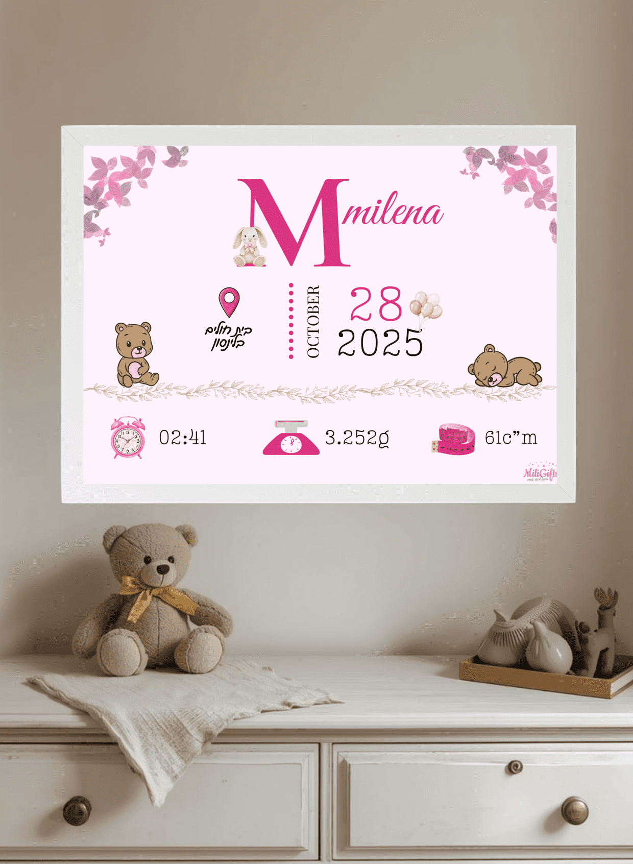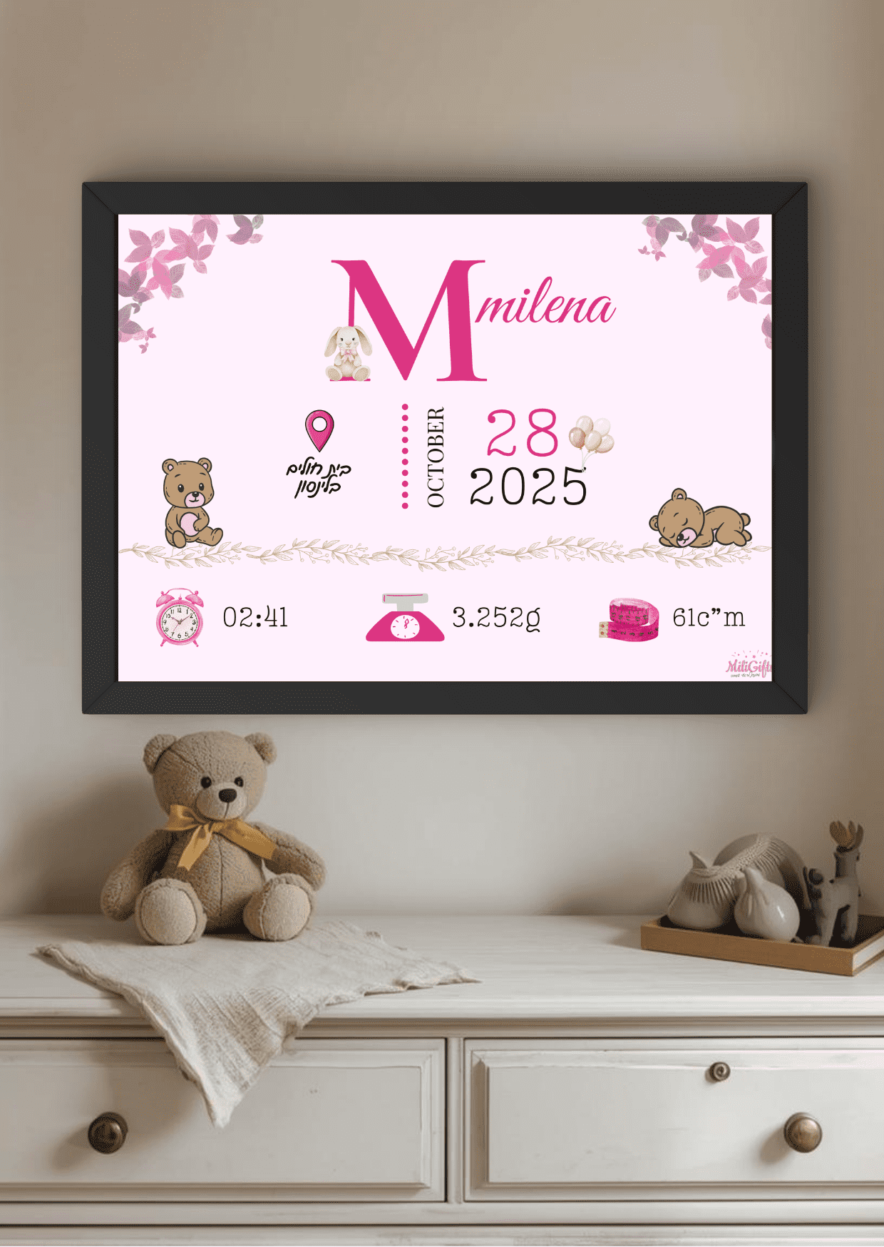 מגיעה בתוך מסגרת A4 לתלייה בחדר התינוקת או מתנה.