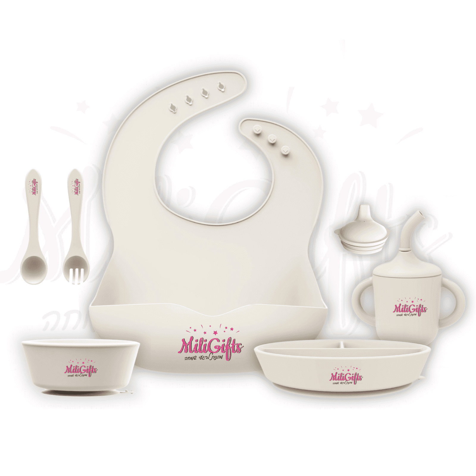 סט האכלה איכותי מסיליקון רך וגמיש, המותאם במיוחד לשלב הטעימות והאכילה העצמאית של התינוקת.